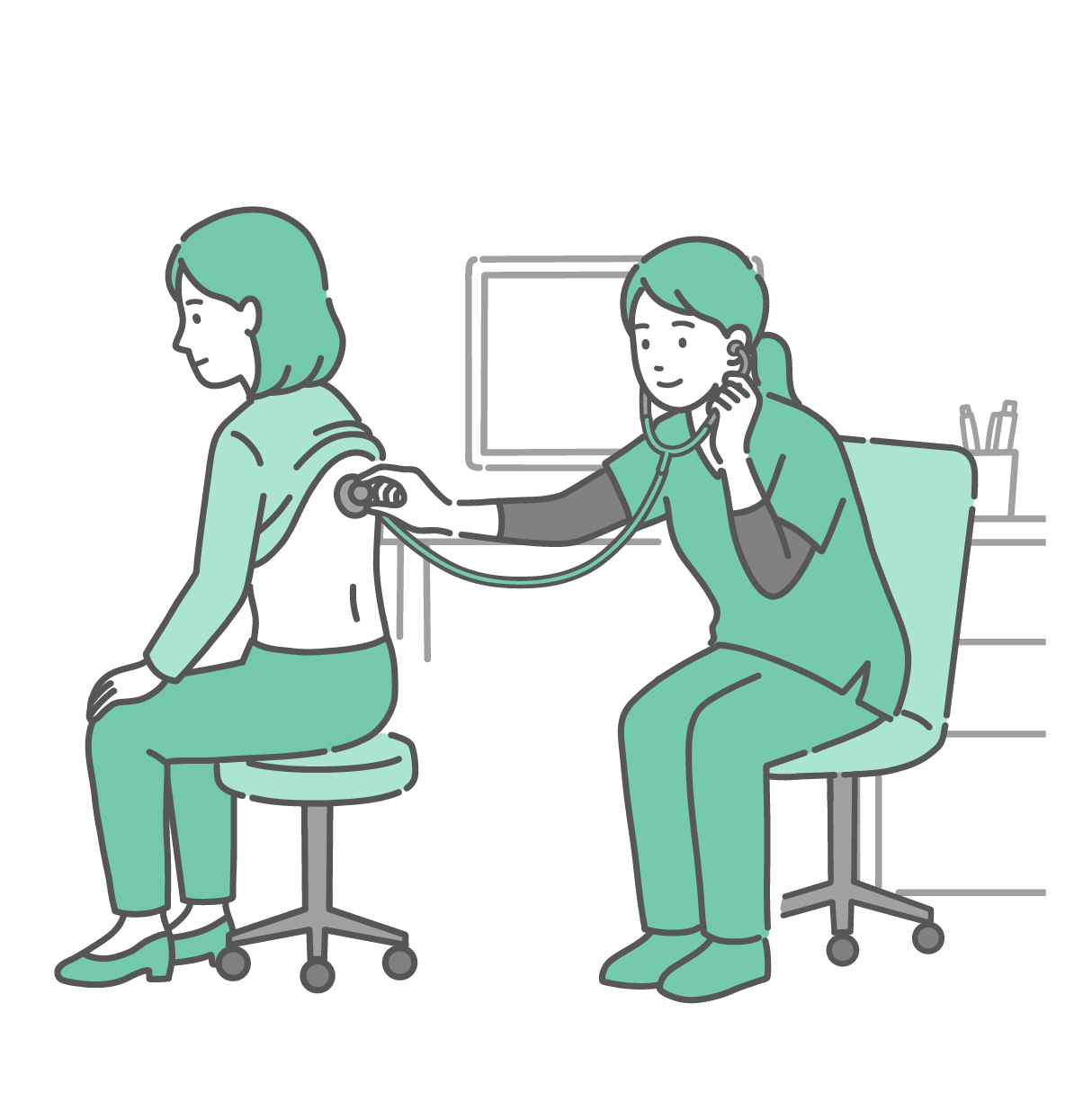 女性の健康・更年期 スクラブを着用した女性医療従事者(医師・看護師)による女性の背中の聴診イラスト