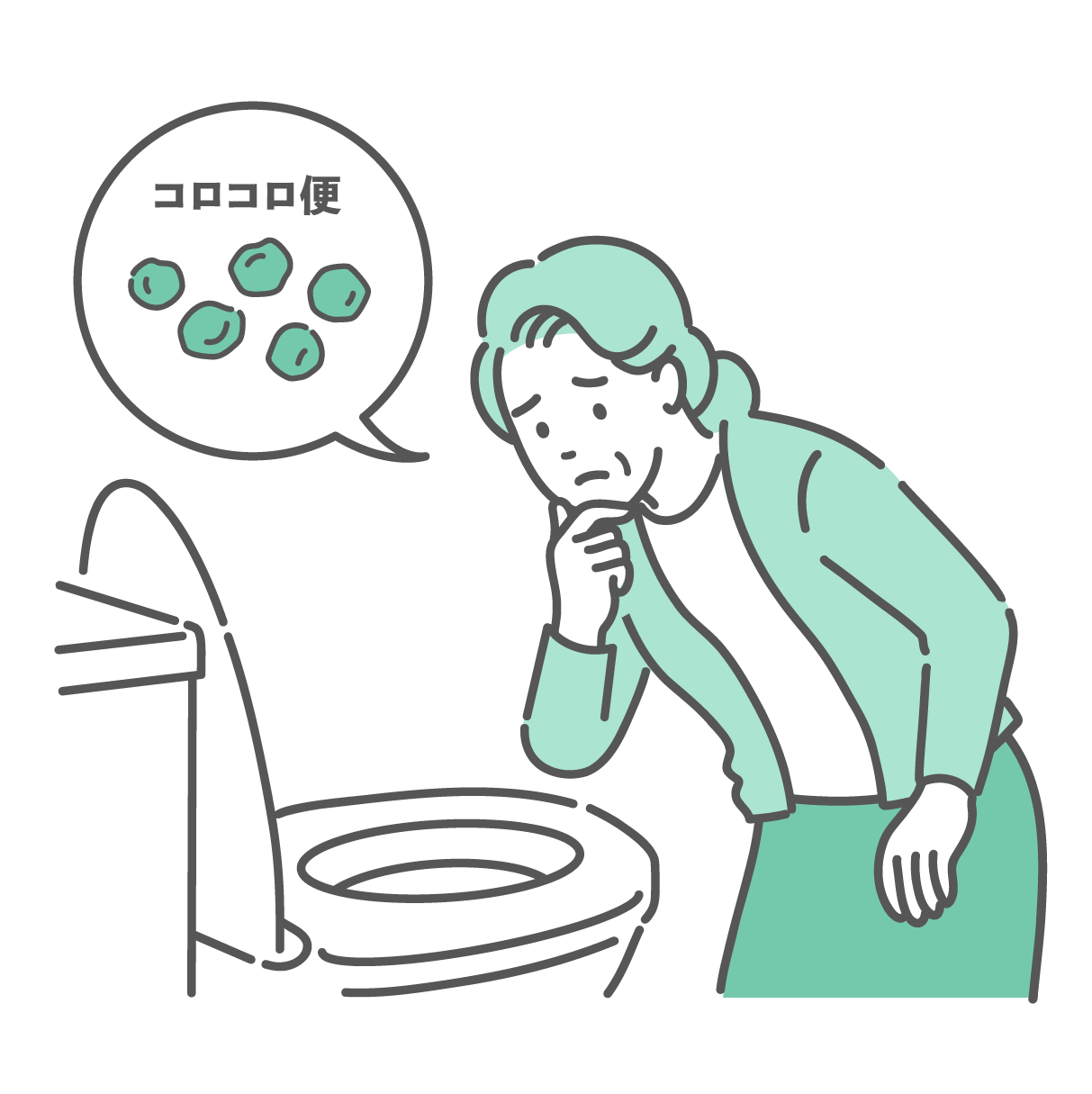 女性の健康・更年期 トイレで「コロコロ便(硬い便)」を確認して悩む女性のイラスト(吹き出し・便秘・ダイエット)