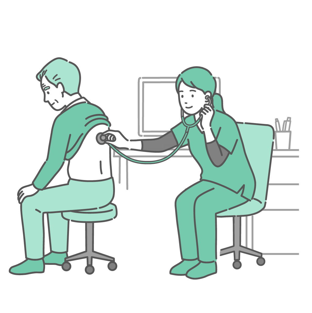 介護・福祉 スクラブを着用した女性医療従事者(医師・看護師)による高齢男性の背中の聴診イラスト