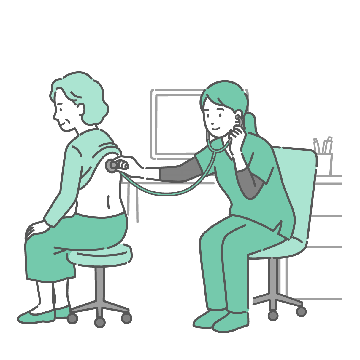 介護・福祉 スクラブを着用した女性医療従事者(医師・看護師)による高齢女性の背中の聴診イラスト