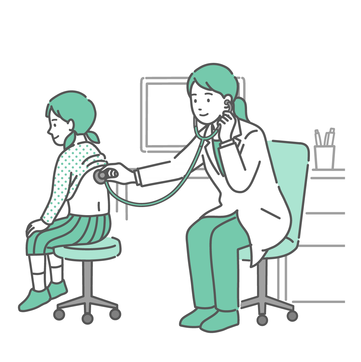 季節・アレルギー症状 白衣を着用した男性医師による女の子の背中の聴診イラスト