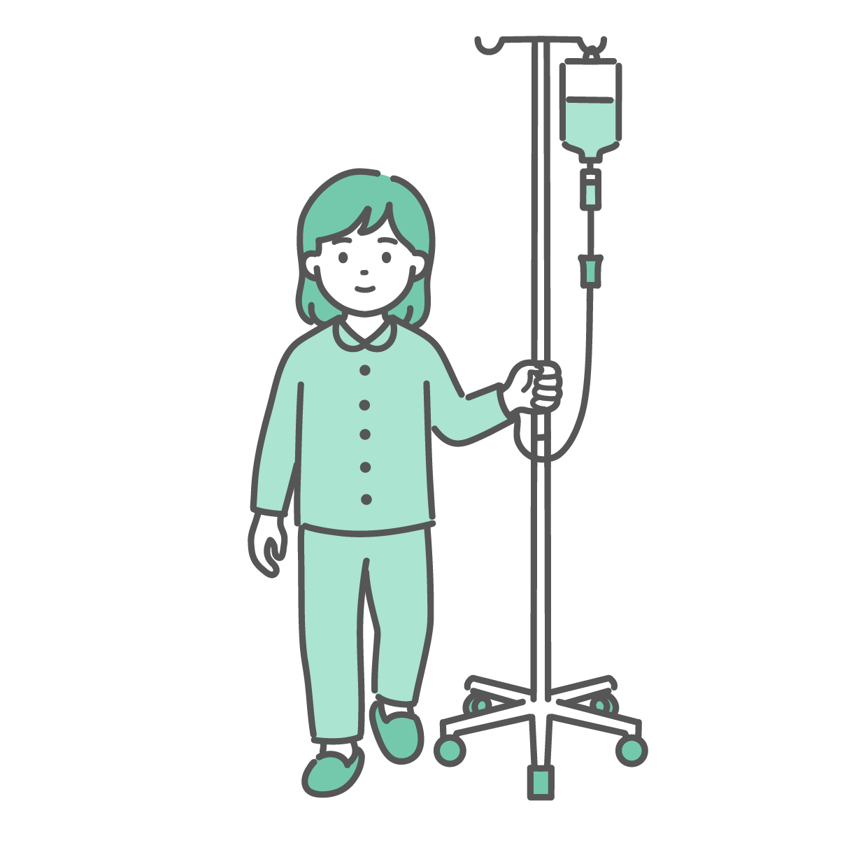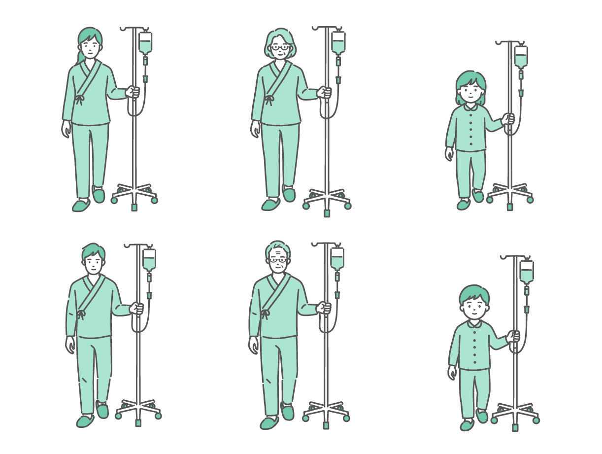 治療・処置 点滴スタンドを押して歩く患者のイラストセット(全世代・男女)