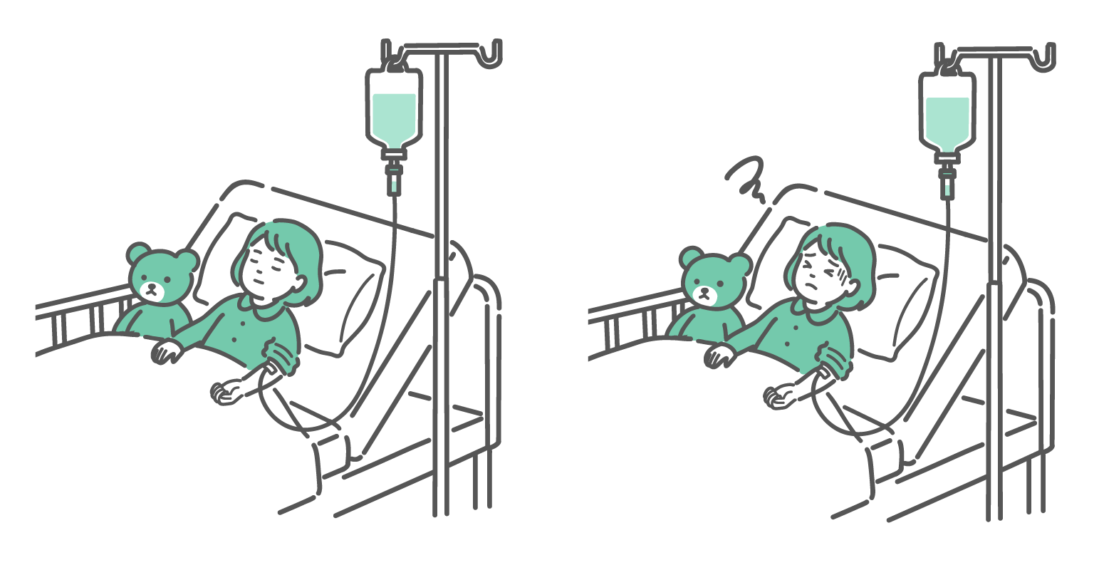 小児科・子供の健康 点滴を受ける女の子の比較イラスト(安静 vs 副作用・体調不良)