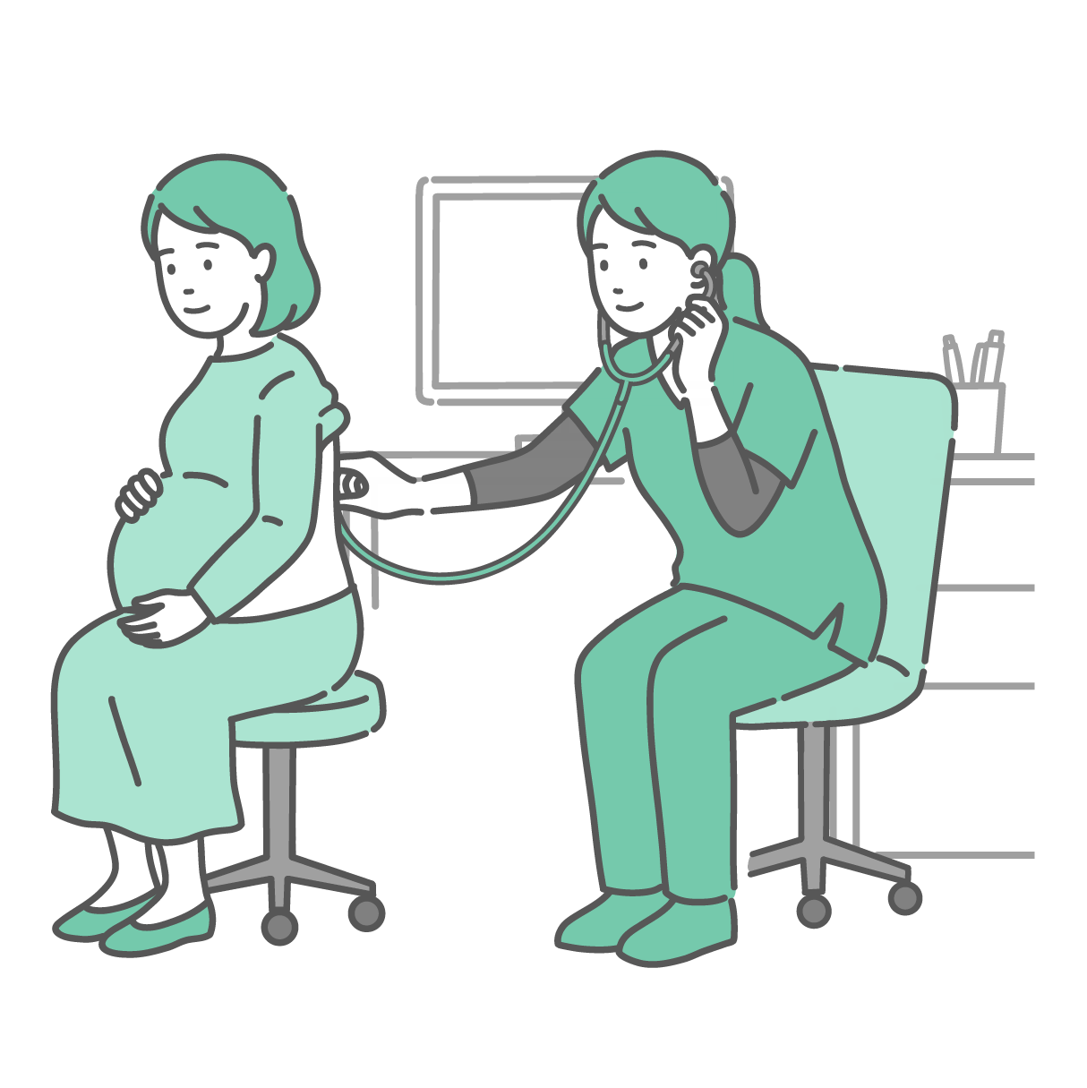 季節・アレルギー症状 スクラブを着用した女性医療従事者(医師・助産師)による妊婦の背中の聴診イラスト
