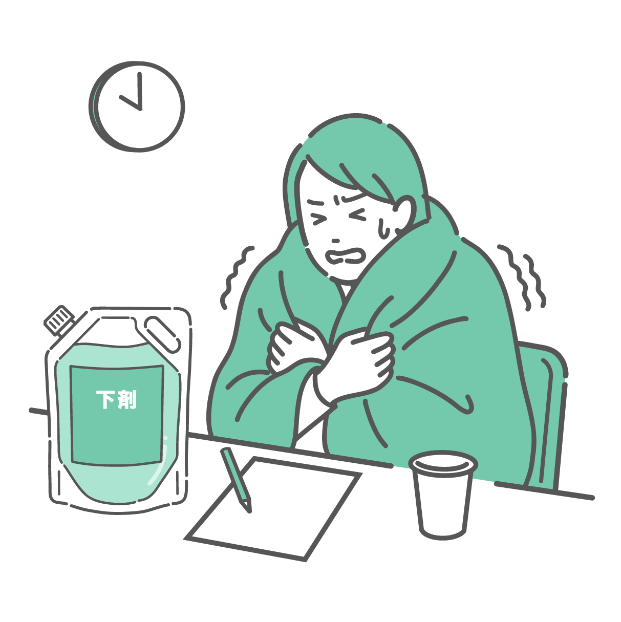 検査・測定 大腸カメラの前処置で下剤を飲んで寒気を感じている女性(副作用・冷え)