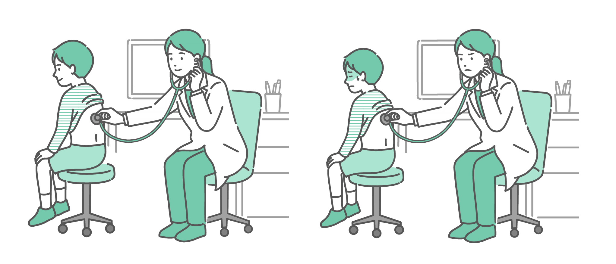 季節・アレルギー症状 白衣を着た女性医師による男の子の背中の聴診イラストセット(正常・異常/体調不良)