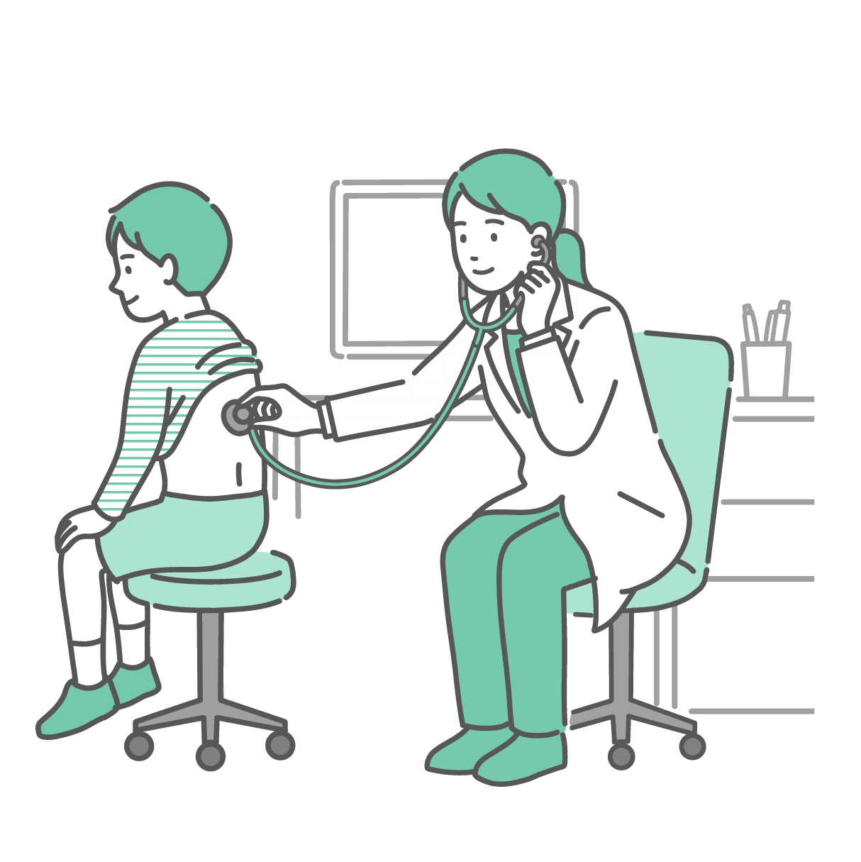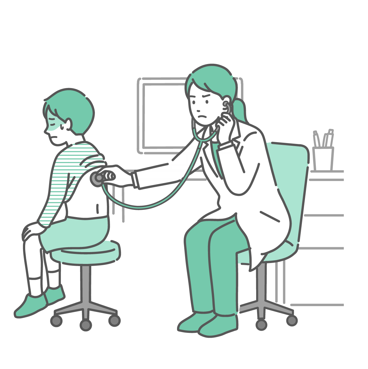 季節・アレルギー症状 背中の聴診を受ける冷や汗をかいた女の子と深刻な表情の白衣の女性医師のイラスト