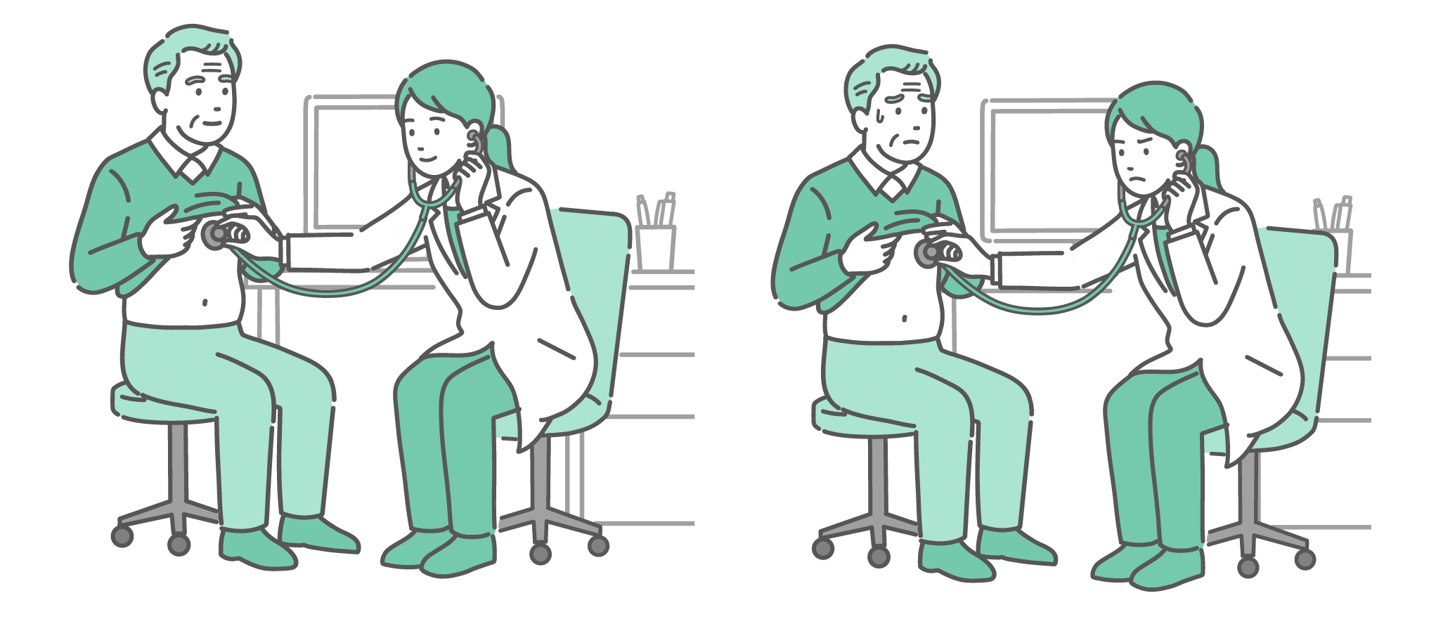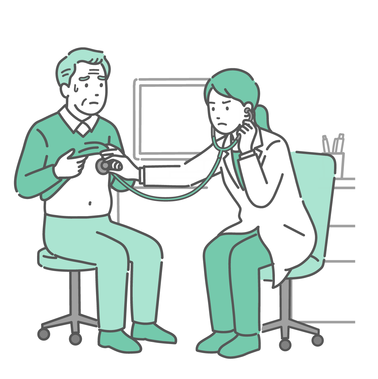 介護・福祉 聴診を受ける冷や汗をかいた高齢男性と深刻な表情の白衣の女性医師のイラスト