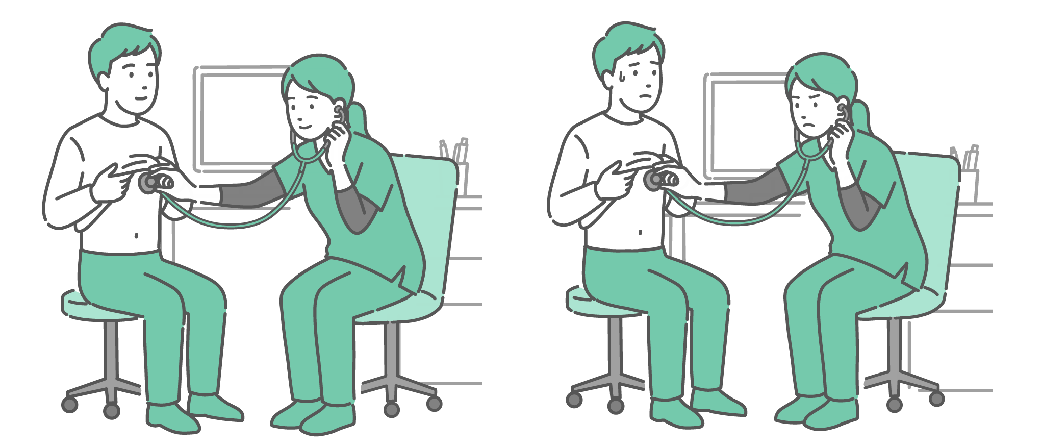 女性の健康・更年期 スクラブを着た女性医療従事者(医師・看護師)による女性の聴診イラストセット(正常・異常/体調不良)