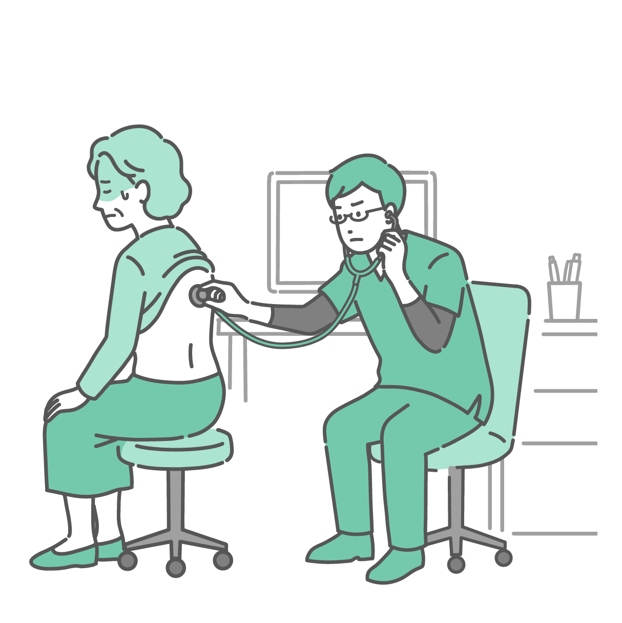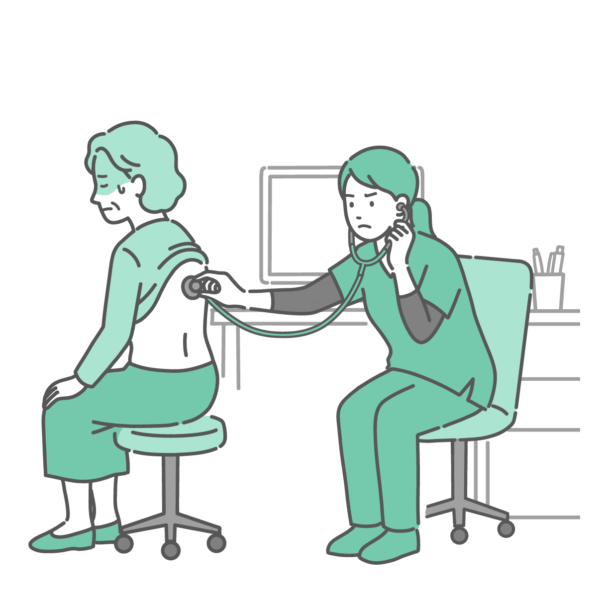 介護・福祉 背中の聴診を受ける冷や汗をかいた高齢女性と深刻な表情のスクラブの男性医師のイラスト