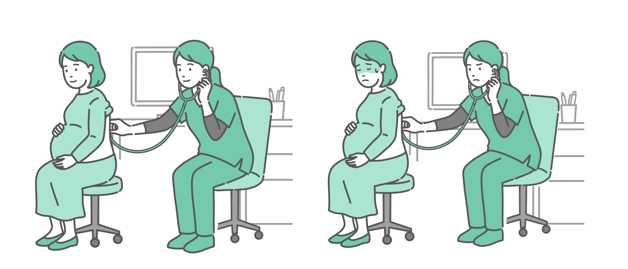介護・福祉 スクラブを着用した女性医療従事者による妊婦の背中の聴診イラストセット(正常・異常/体調不良)