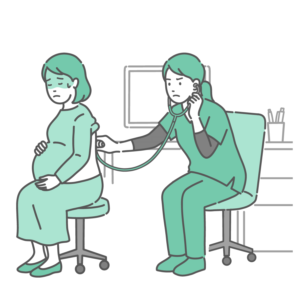 女性の健康・更年期 背中の聴診を受ける冷や汗をかいた妊婦と深刻な表情のスクラブ姿の女性医療従事者のイラスト