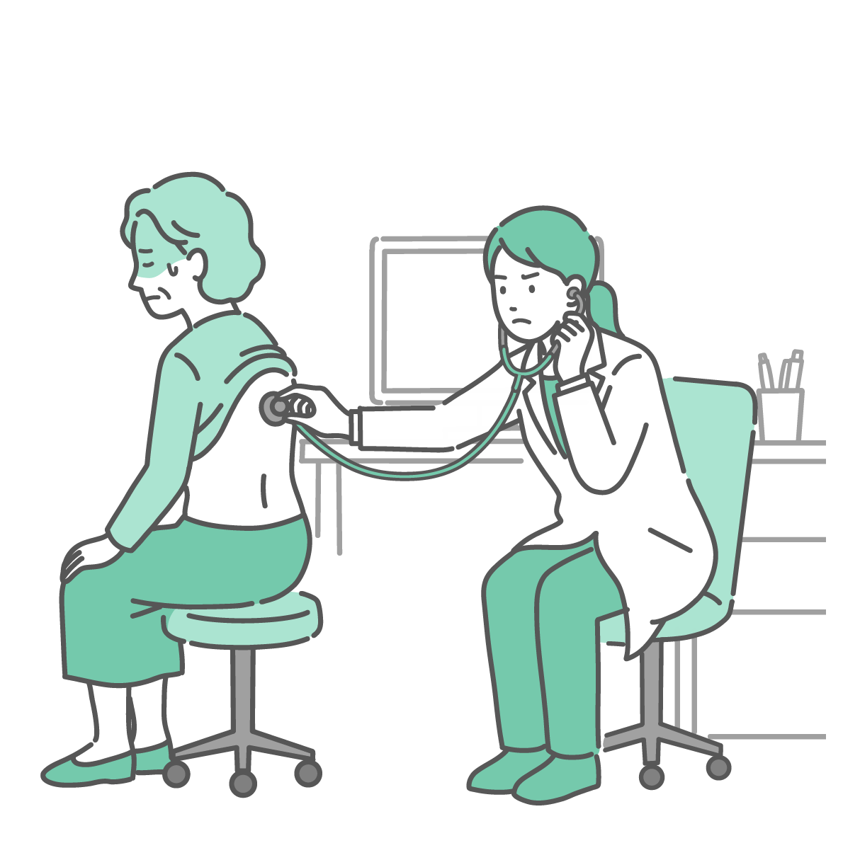 介護・福祉 背中の聴診を受ける冷や汗をかいた高齢女性と深刻な表情の白衣の女性医師のイラスト