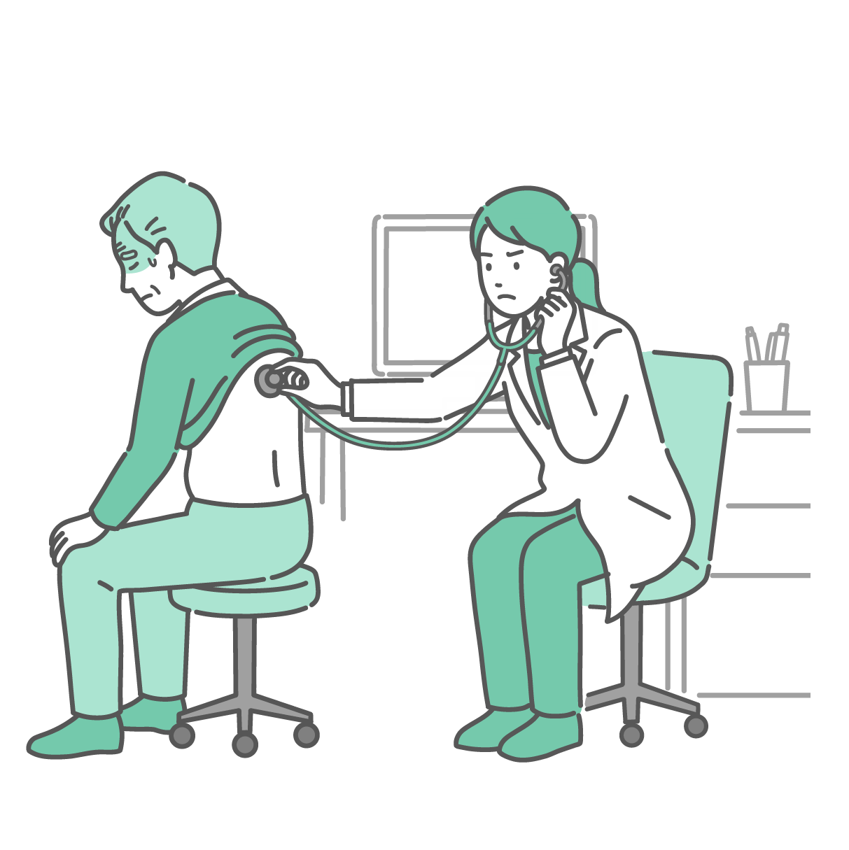介護・福祉 背中の聴診を受ける冷や汗をかいた高齢男性と深刻な表情の白衣の女性医師のイラスト