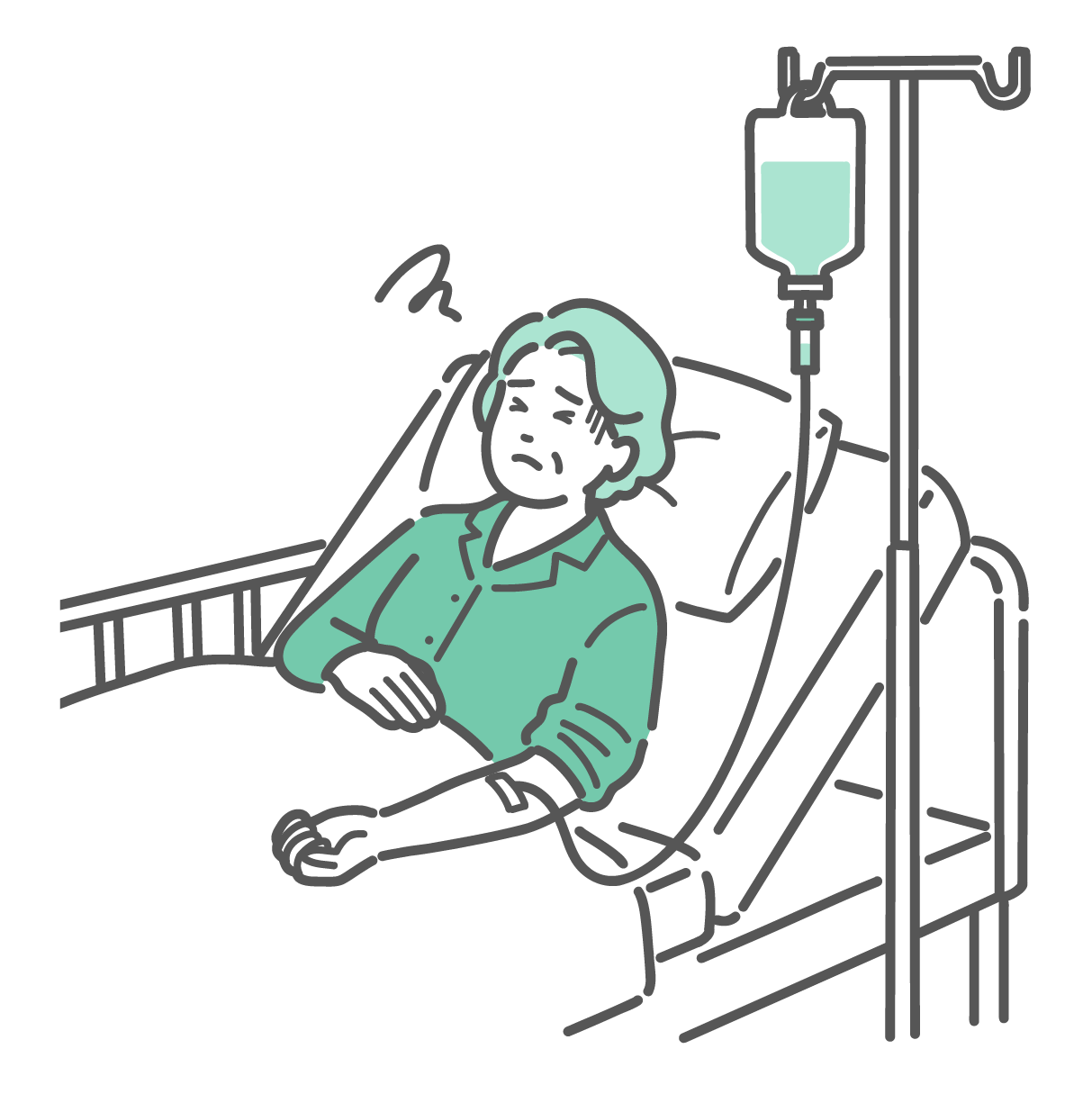 介護・福祉 点滴中に気分が悪そうな高齢の女性患者のイラスト(副作用・急変)