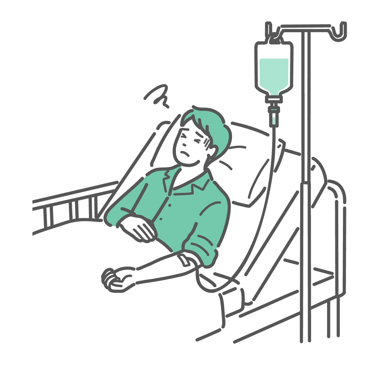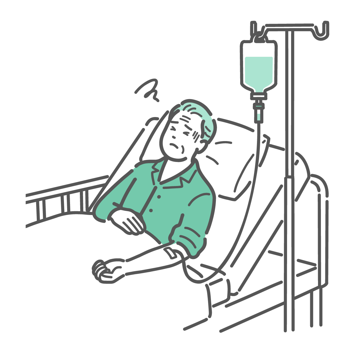 慢性的な痛み・不調 点滴中に気分が悪そうな男性患者のイラスト(副作用・体調不良)