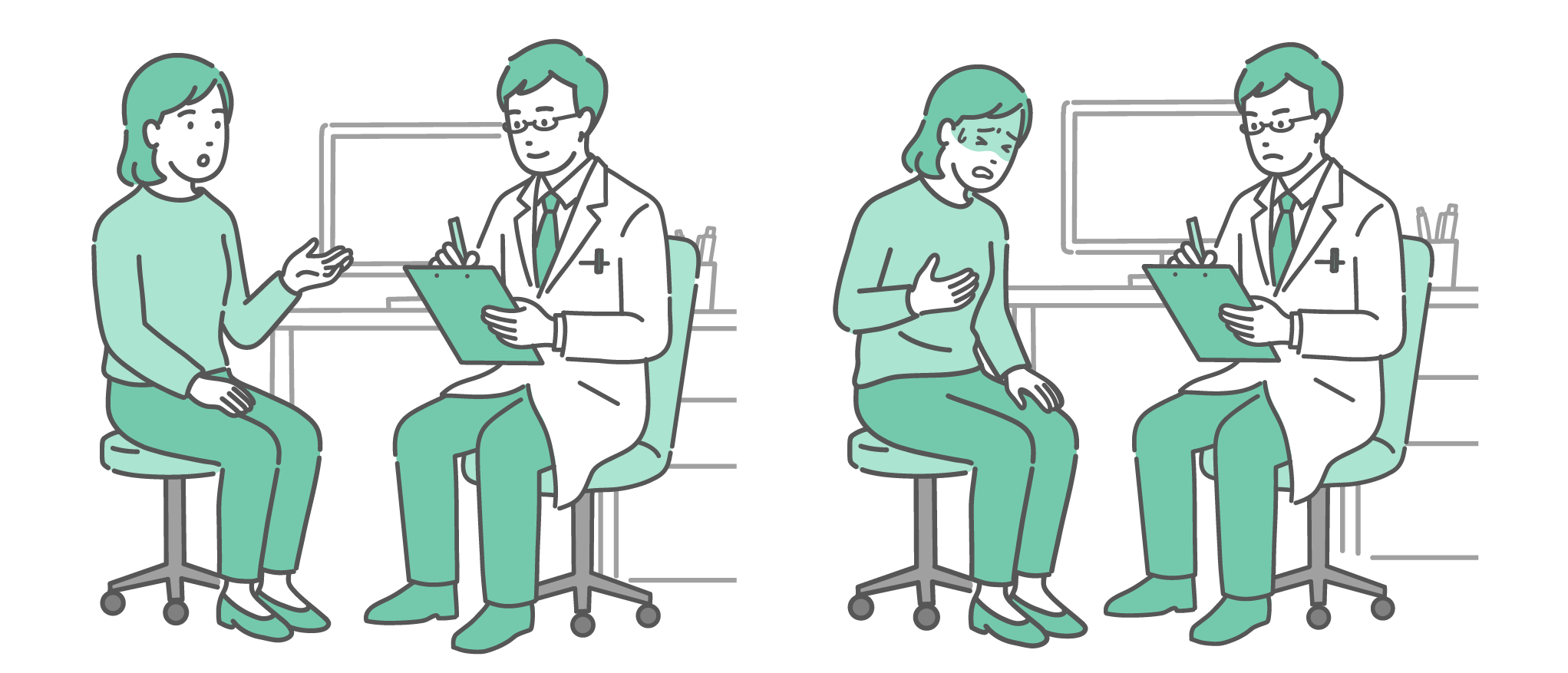 体調不良を訴える女性患者と男性医師(白衣・救急・循環器)