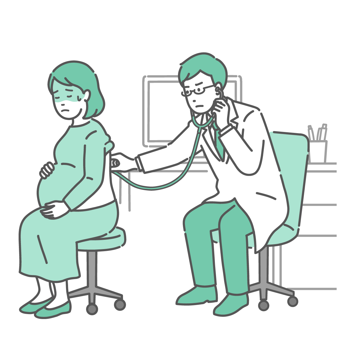 女性の健康・更年期 背中の聴診を受ける冷や汗をかいた妊婦と深刻な表情のスクラブの男性医師のイラスト