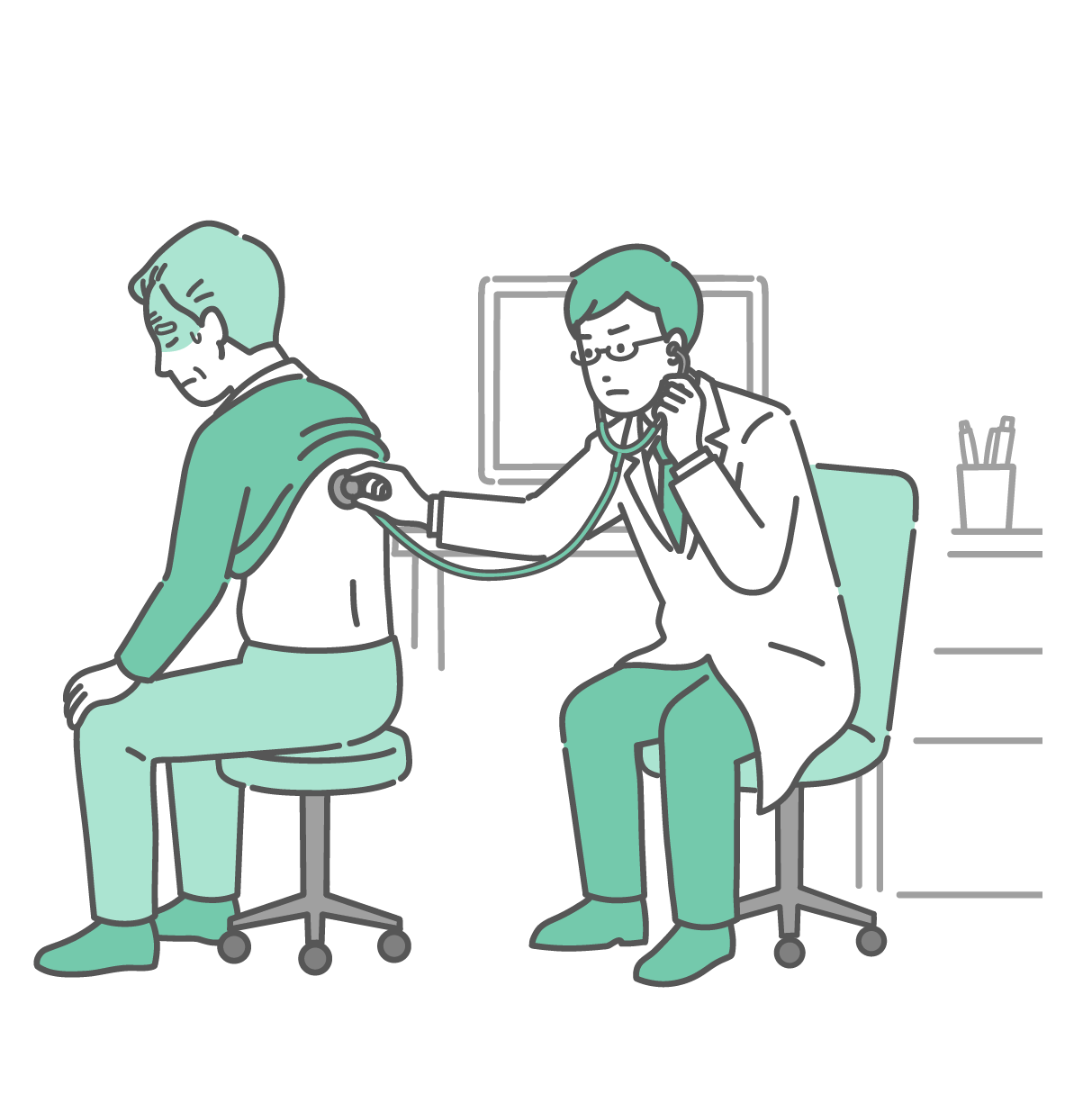 季節・アレルギー症状 背中の聴診を受ける冷や汗をかいた男性と深刻な表情のスクラブの男性医師のイラスト