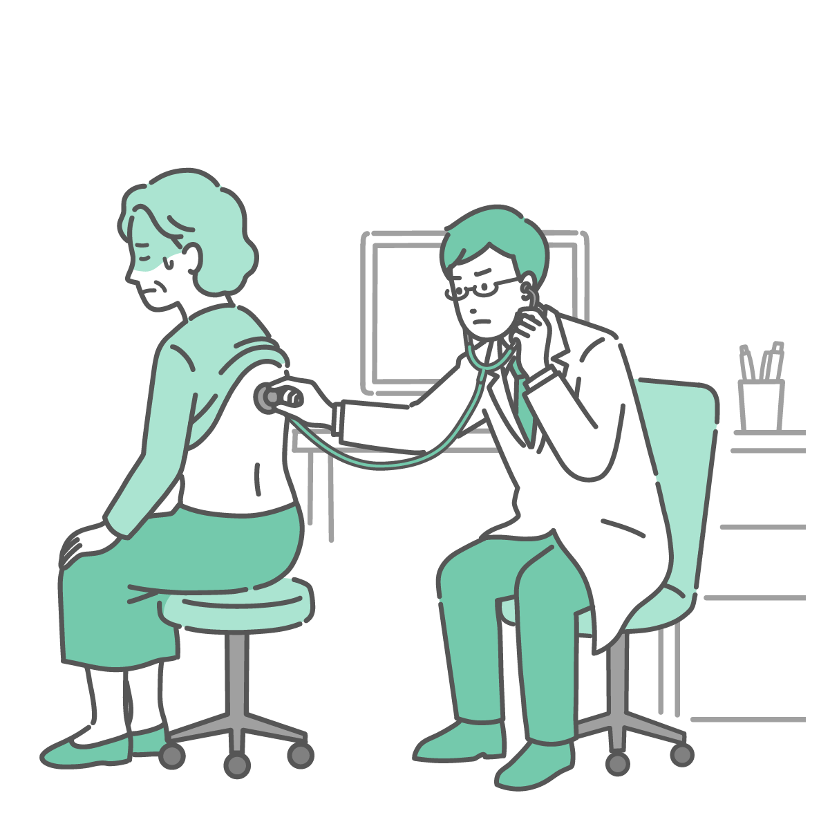 介護・福祉 背中の聴診を受ける冷や汗をかいた高齢女性と深刻な表情の白衣の男性医師のイラスト