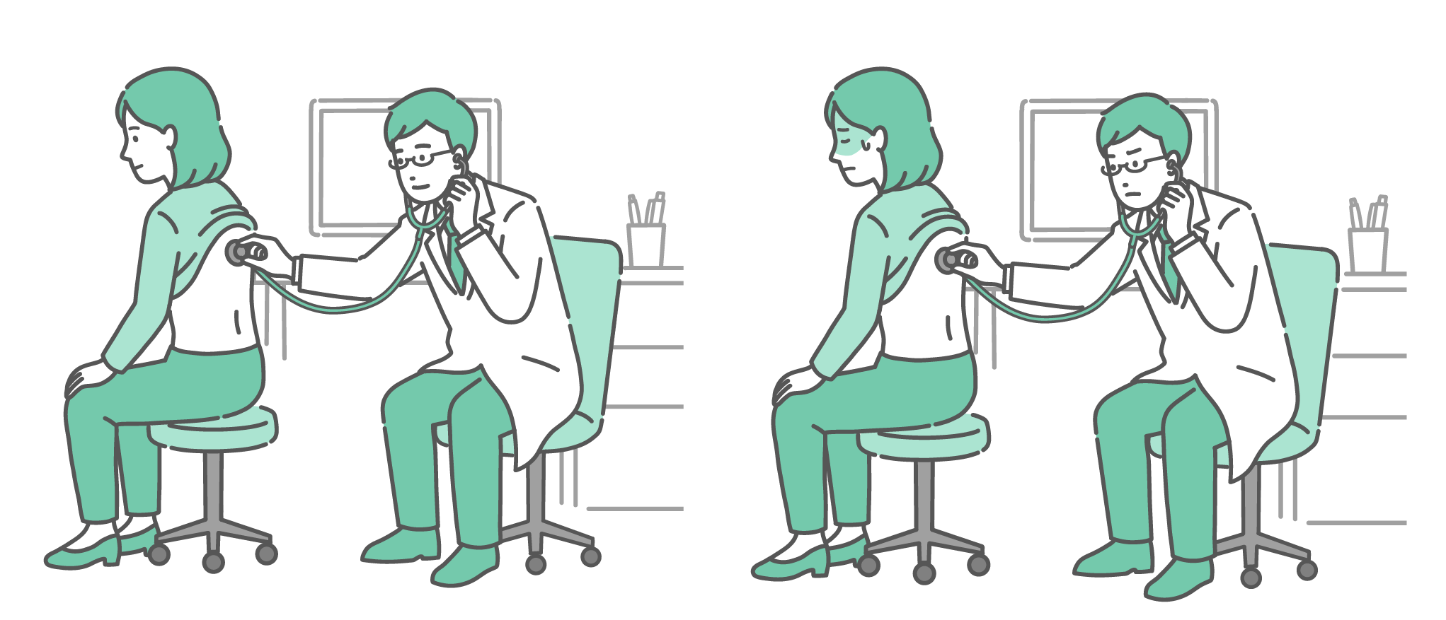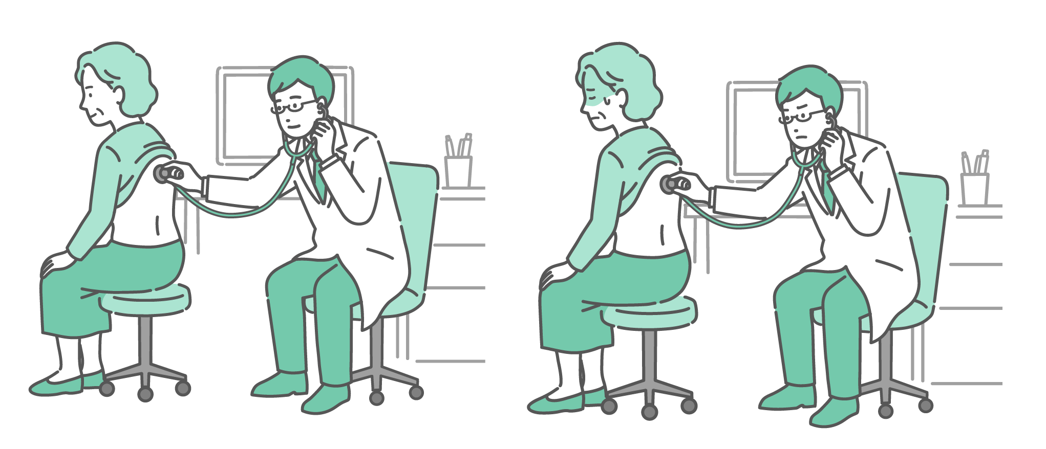介護・福祉 白衣を着用した男性医師による高齢女性の背中の聴診イラストセット(正常・異常/体調不良)