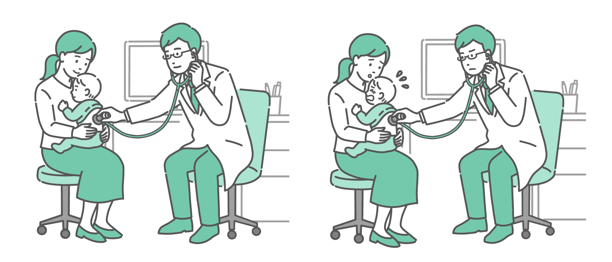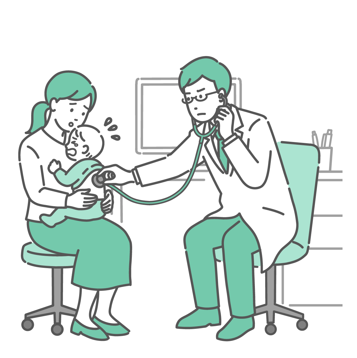 季節・アレルギー症状 泣いている赤ちゃんの背中を聴診する深刻な表情の白衣の男性医師のイラスト