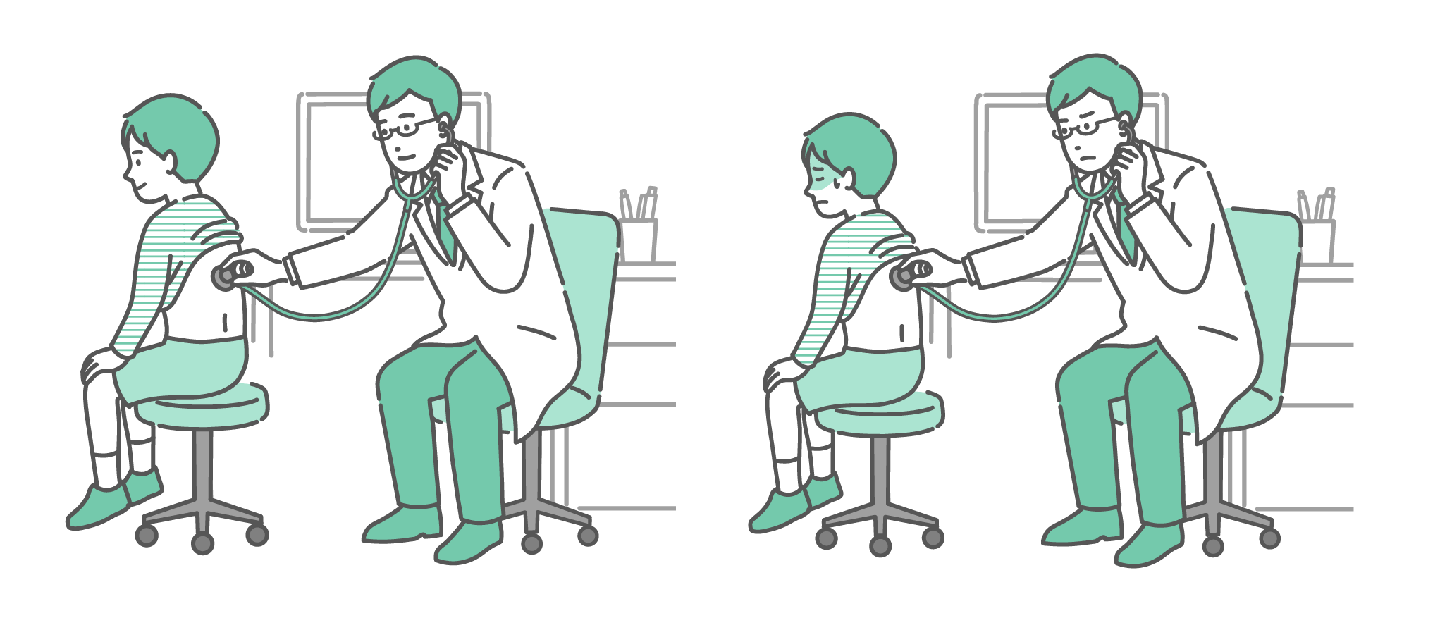季節・アレルギー症状 白衣を着用した男性医師による男の子の背中の聴診イラストセット(正常・異常/体調不良)