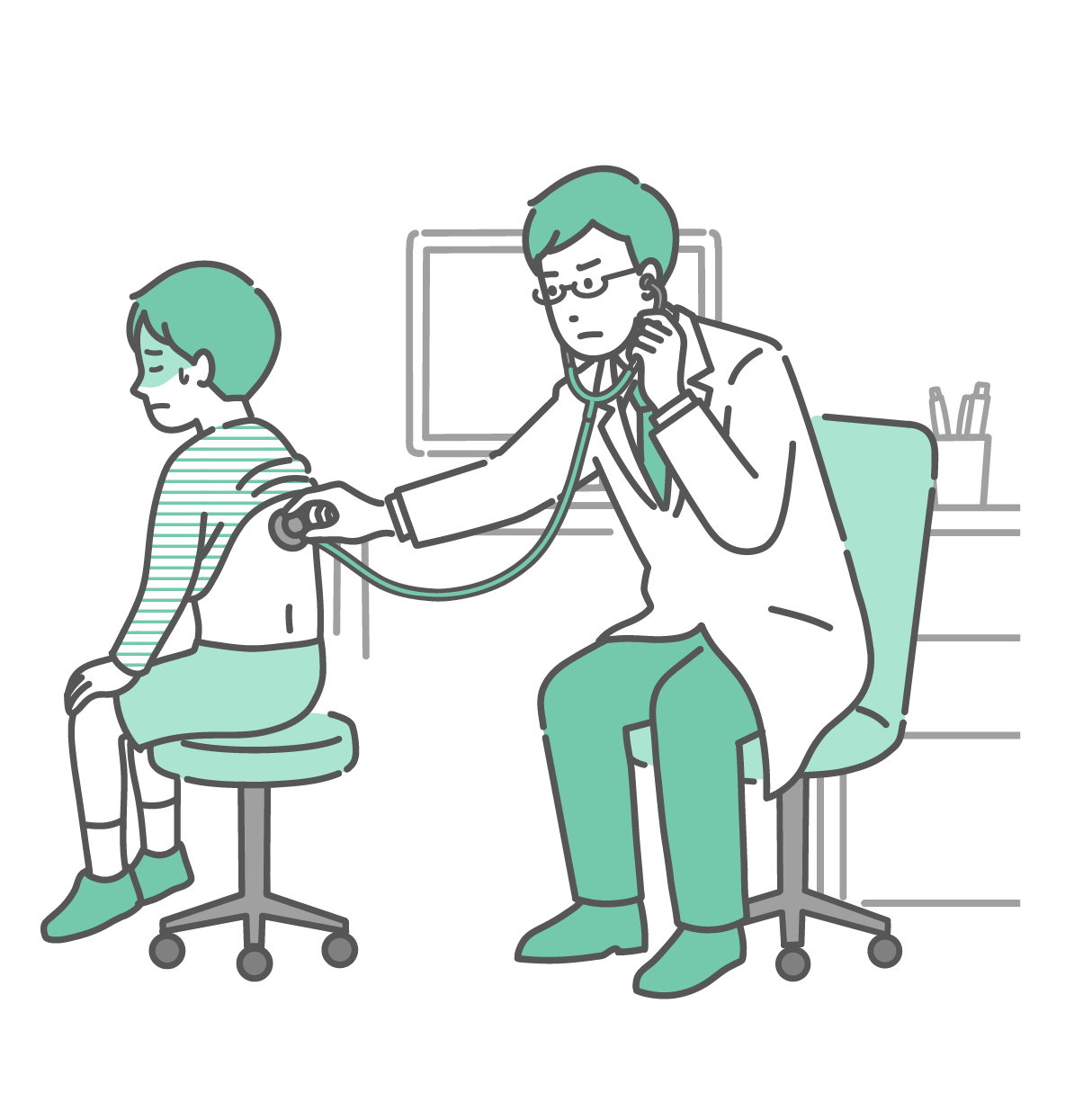 季節・アレルギー症状 白衣を着用した男性医師による男の子の背中の聴診イラスト