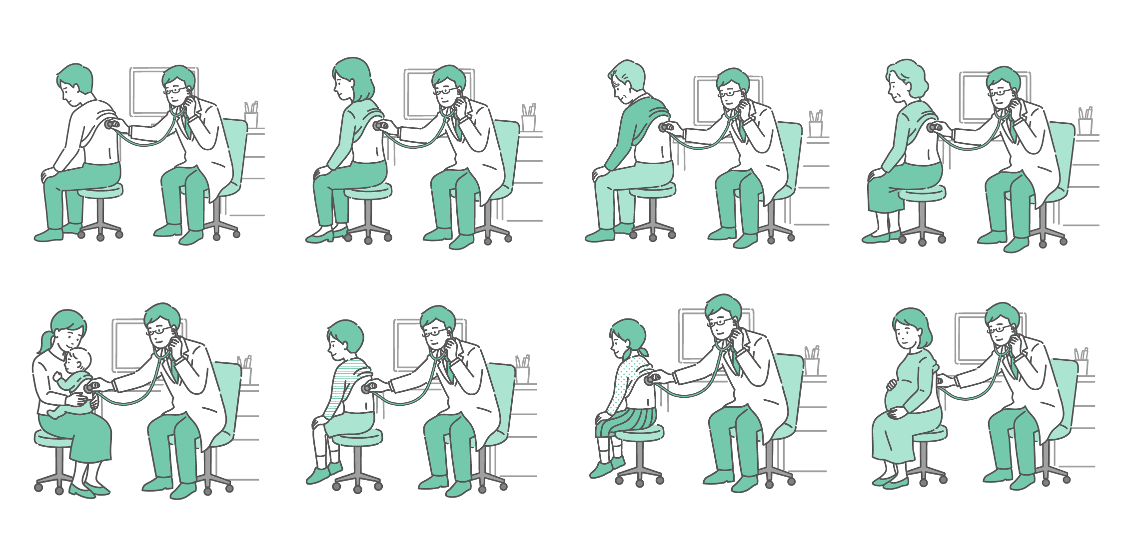介護・福祉 白衣を着用した男性医師による背中の聴診イラストセット(老若男女・妊婦・乳児)