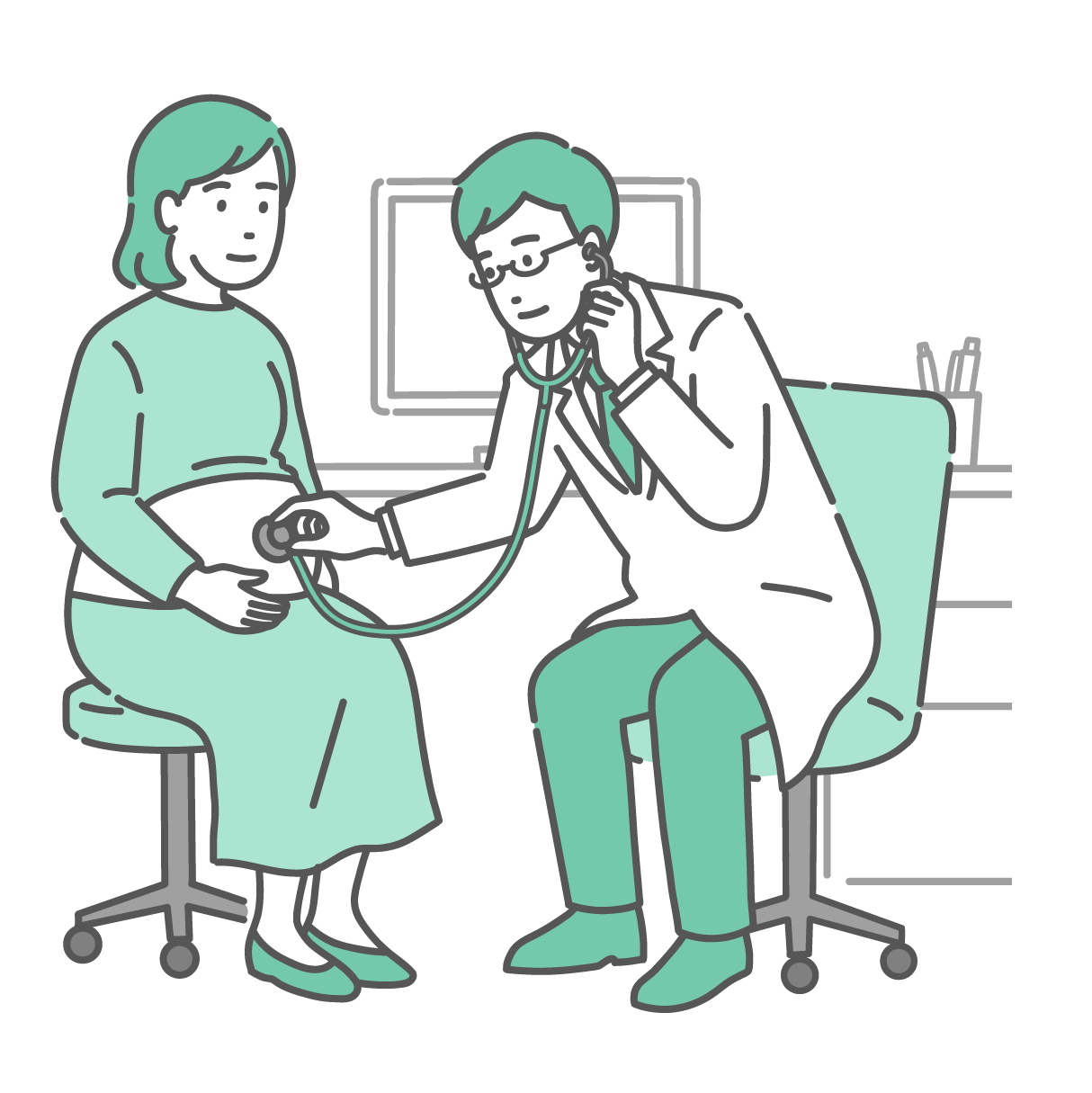 女性の健康・更年期 聴診器で妊婦のお腹の音を聞く男性医師(白衣・産婦人科・妊婦健診)