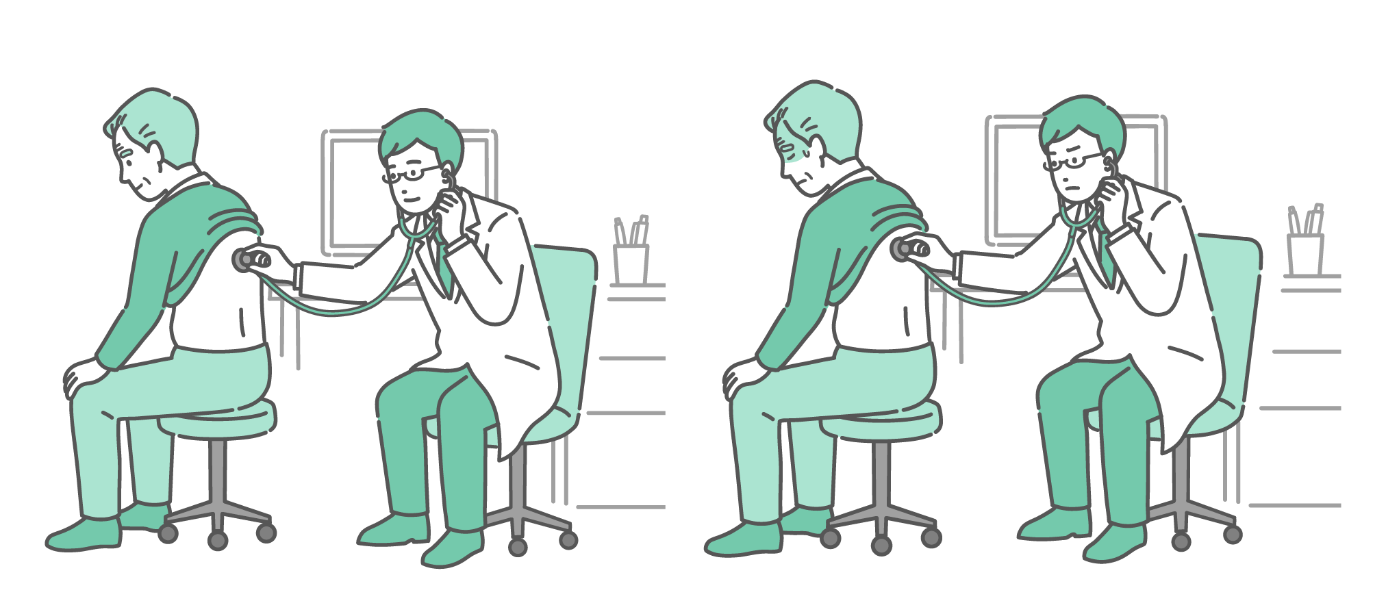 介護・福祉 白衣を着用した男性医師による高齢男性の背中の聴診イラストセット(正常・異常/体調不良)