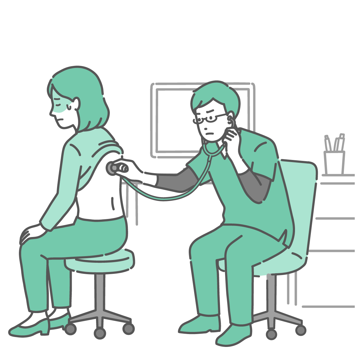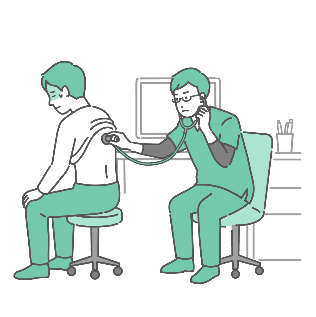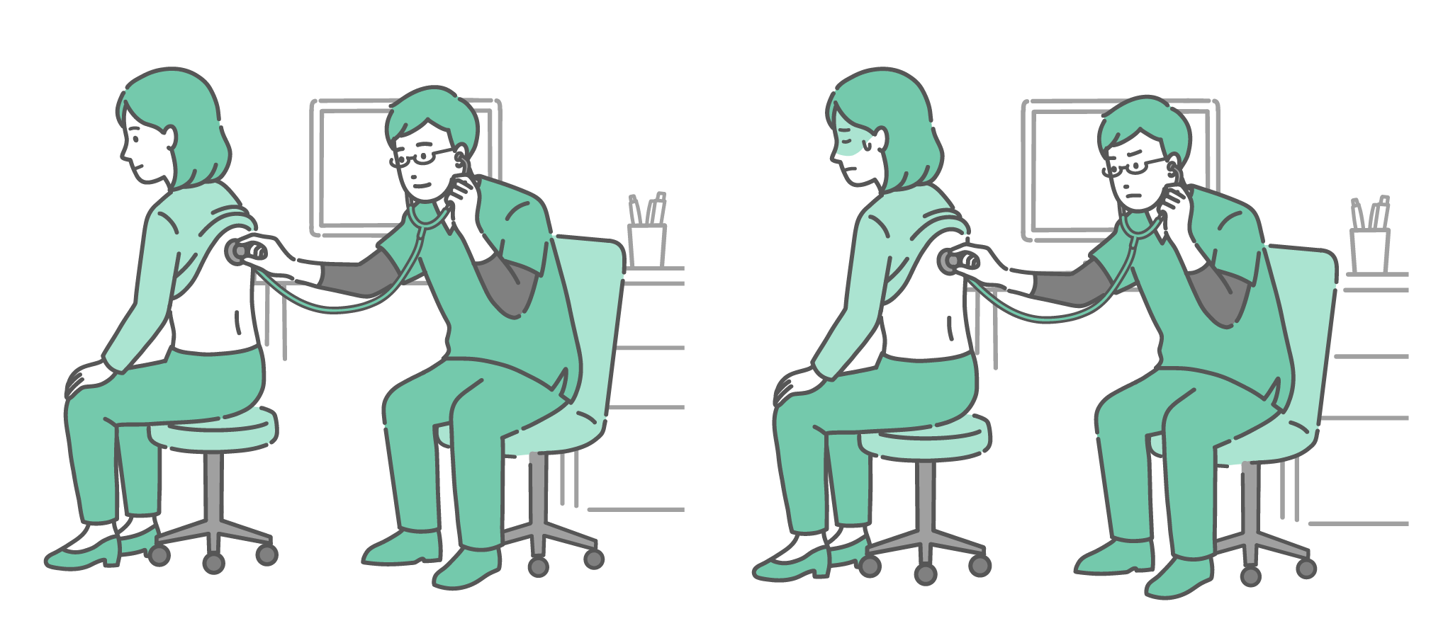季節・アレルギー症状 背中の聴診を受ける冷や汗をかいた男性と深刻な表情のスクラブの男性医師のイラスト