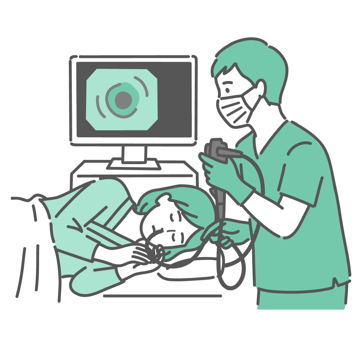 胃カメラ検査(経口内視鏡)を受ける女性と医師のイラスト
