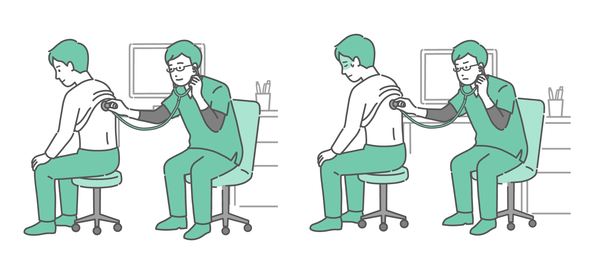 季節・アレルギー症状 スクラブを着用した男性医師による男性の背中の聴診イラストセット(正常・異常/体調不良)