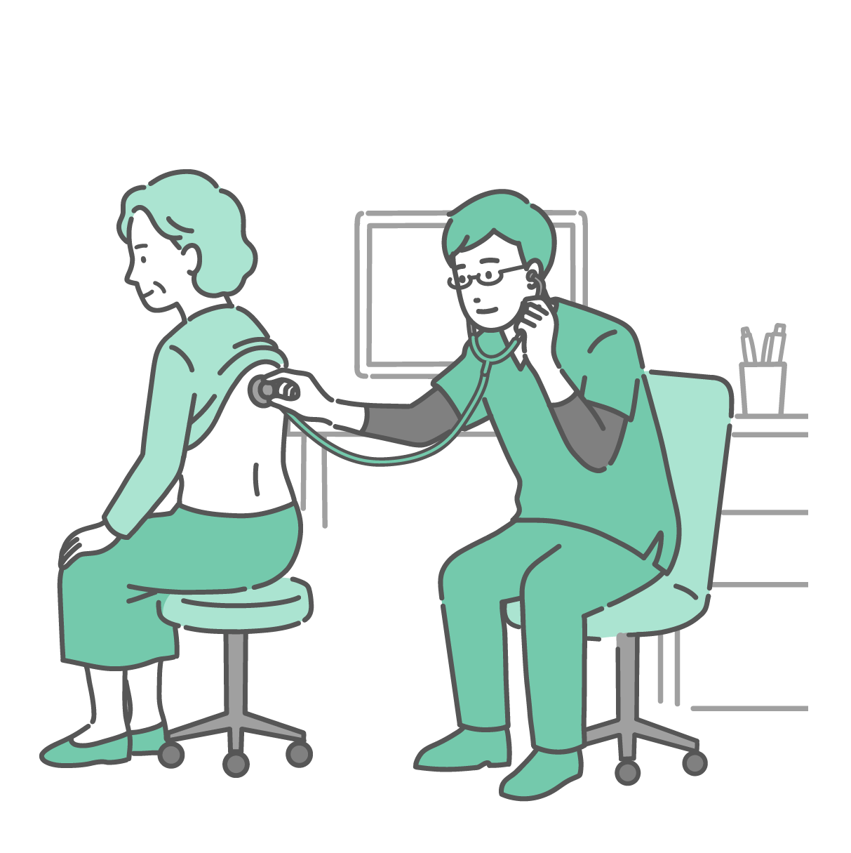 介護・福祉 スクラブを着用した男性医師による高齢女性の背中の聴診イラスト