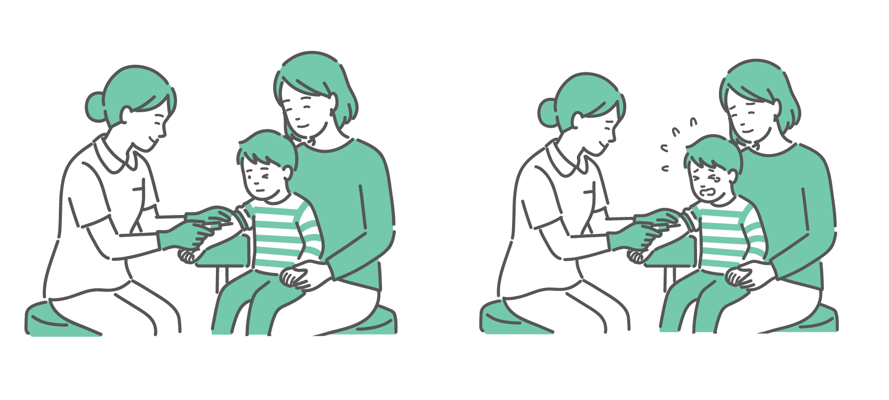 採血に臨む男の子の比較イラスト(落ち着いた vs 泣いて嫌がる)
