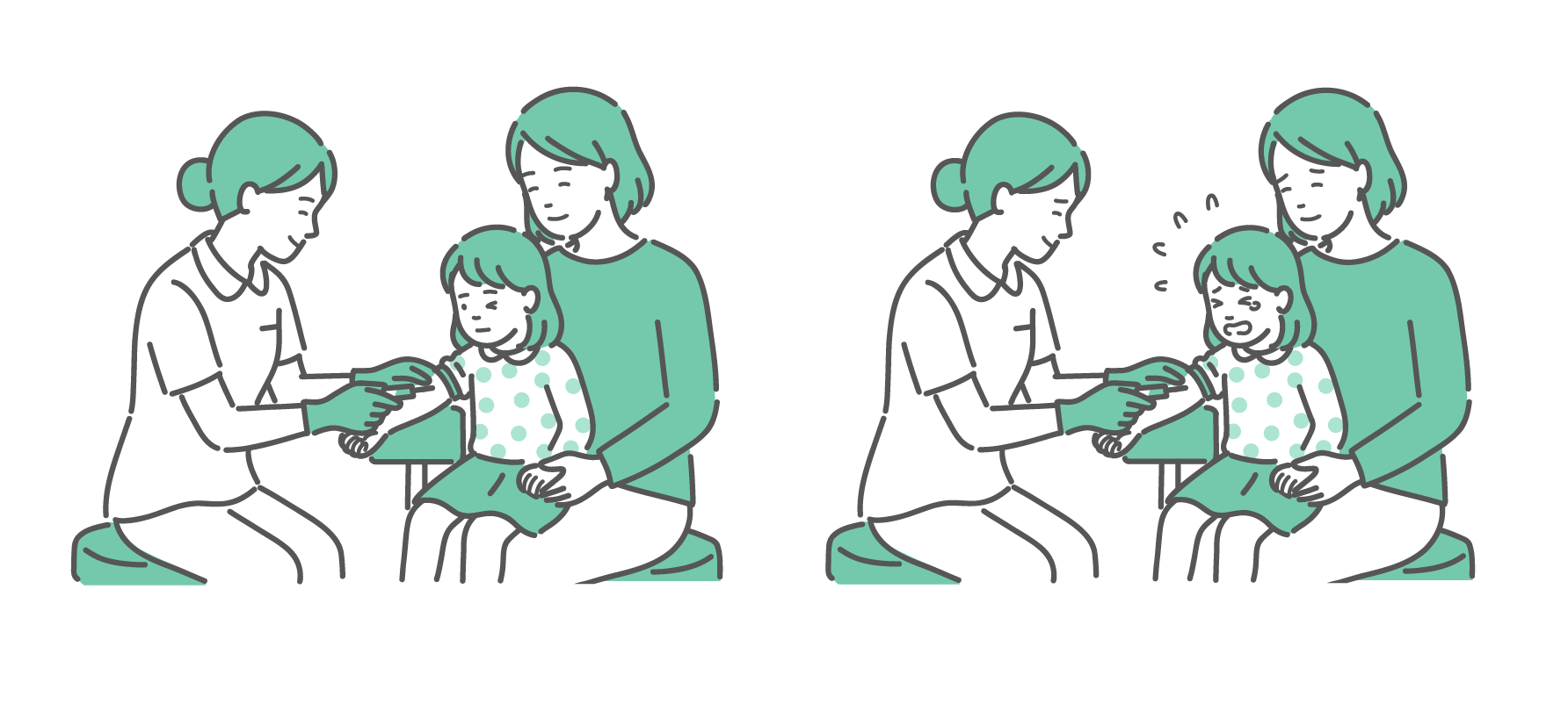 採血に臨む女の子の比較イラスト(落ち着いた vs 泣いて嫌がる)