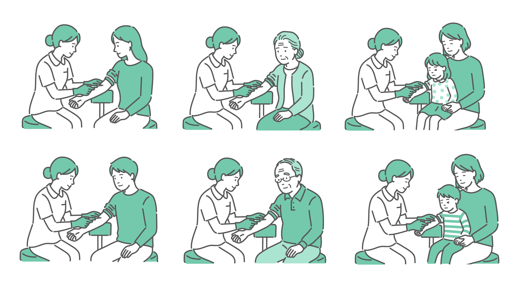 採血・注射のバリエーションイラストセット(全年齢・男女・子供)