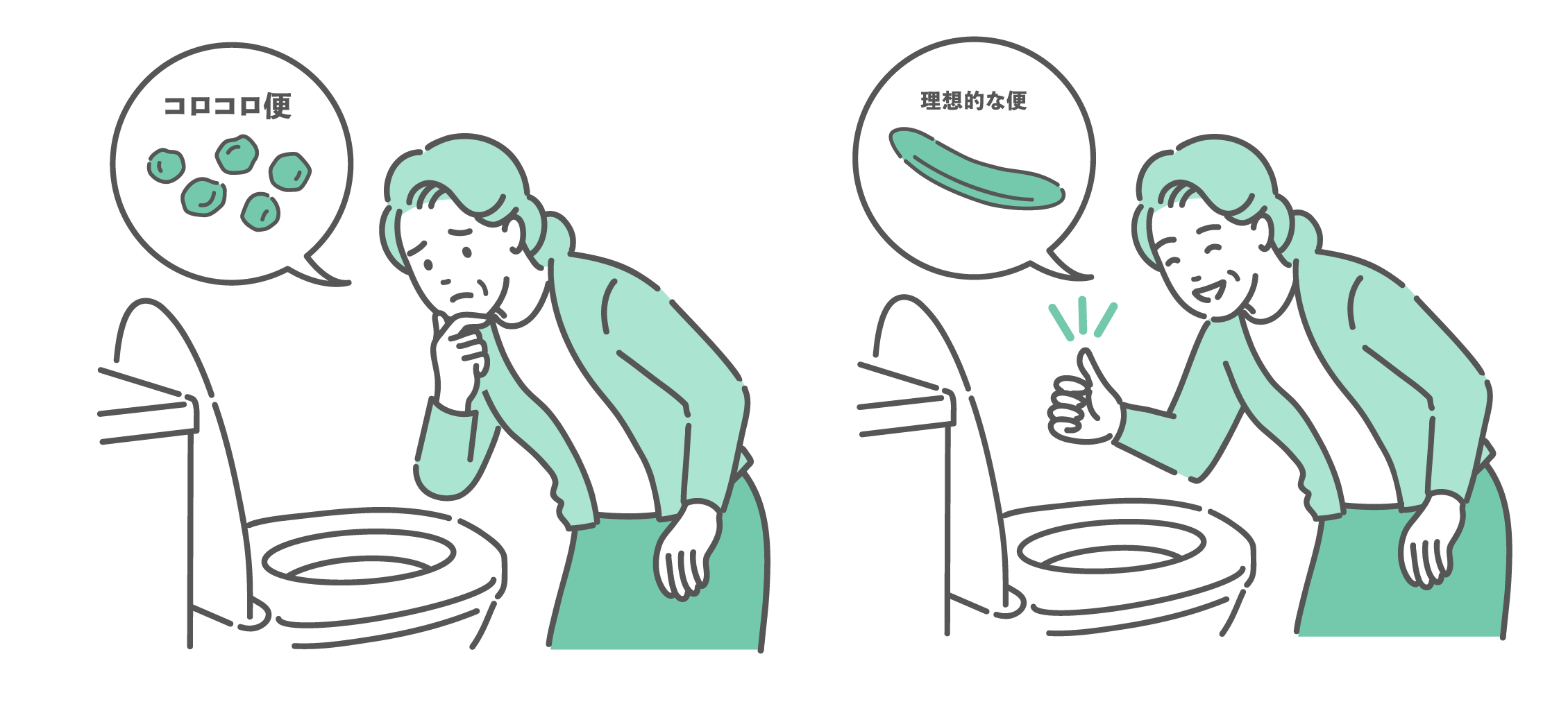 介護・福祉 便の状態比較イラスト(高齢女性・コロコロ便NG vs 理想的な便OK・便秘改善)