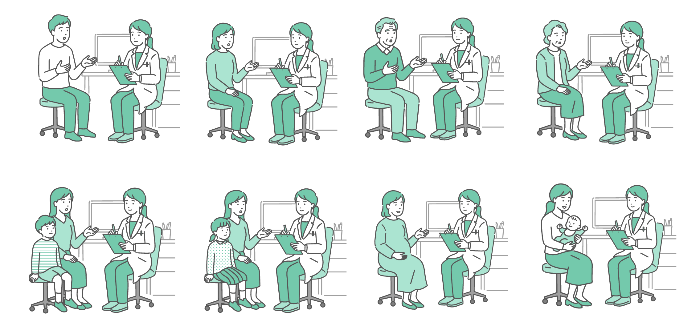 検査・測定 問診・診察のイラストセット(女性医師と様々な患者・8種)