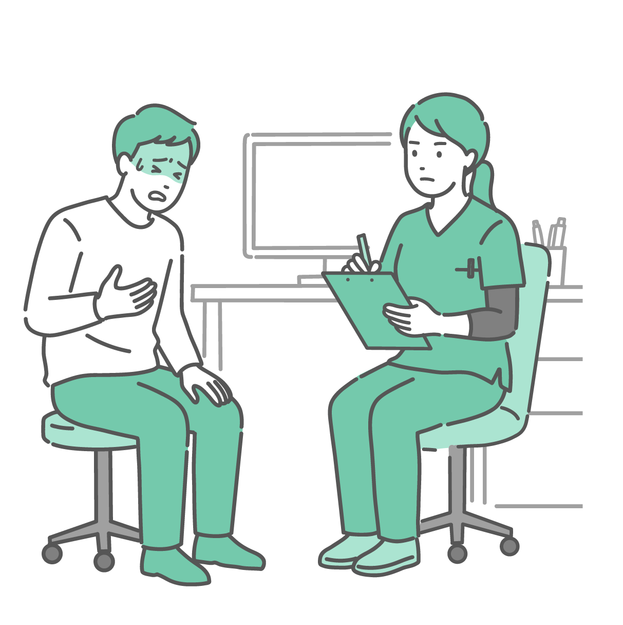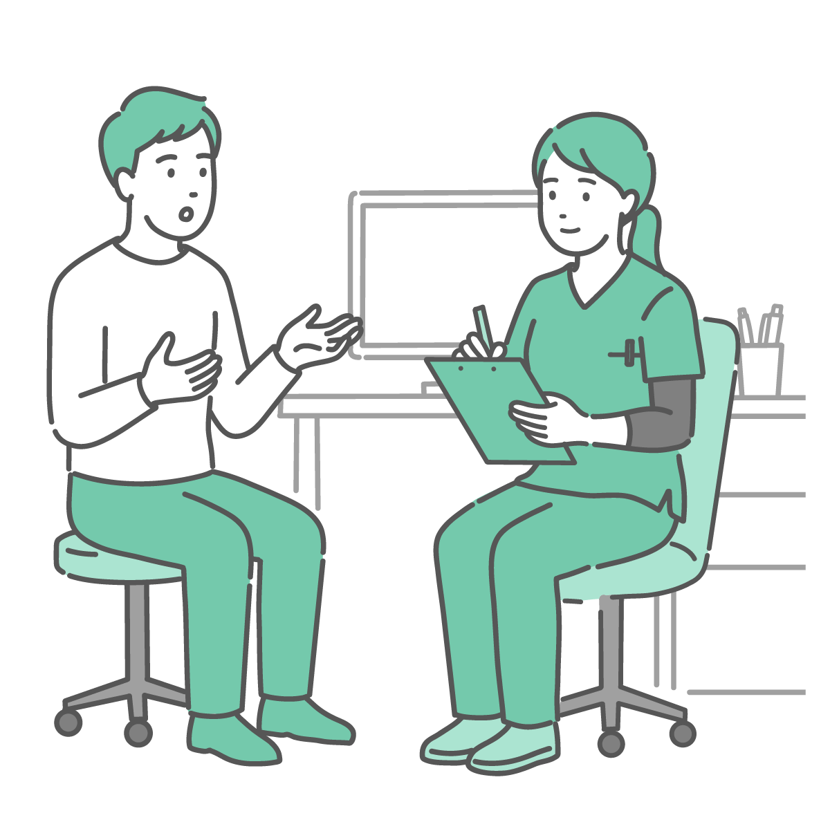 検査・測定 問診をする女性医師と男性患者(スクラブ・医療従事者)